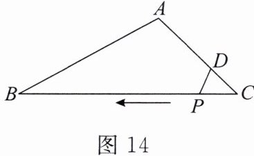9. 如图 14,在△ABC 中,$AC = 3$cm,$BC = 6$cm,D 是 AC 上一点,$AD = 2$cm,点 P 从点 C 处出发,沿 CB 边以 1 cm/s 的速度运动至点 B 处,线段 DP 将△ABC 分成两部分,其中一部分与△ABC 相似,设运动时间为$t$s.求所有满足条件的$t$的值.