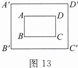 8. 如图 13,有一个矩形花坛 ABCD,其中$AB = 20$m,$AD = 30$m.现要在矩形花坛的四周修建小路.如果四周的小路的宽均相等,那么小路四周所围成的矩形 A'B'C'D'与矩形 ABCD 相似吗?请说明理由.