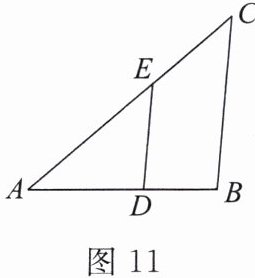 6. 如图 11,已知△ABC∽△ADE,$\frac{AE}{EC} = \frac{5}{3}$,$BC = 6$cm,$∠A = 40°$,$∠C = 45°$.