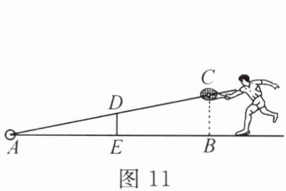 2. 如图 11,小明某次击球时,球恰好过网,且落在与球网($ DE $)水平距离为 $ 4 \, m $ 的点 $ A $ 处,已知网高 $ DE = 0.8 \, m $,球拍击球的位置到球网的水平距离 $ BE = 3.5 \, m $,则球拍击球的高度 $ BC $ 为( ).(假设球沿直线飞行)