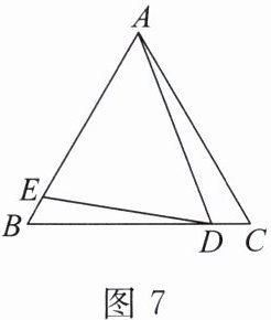 2. (2023 山东东营中考改编)如图 7,$△ABC$为等边三角形,点 D,E 分别在边 BC,AB 上,$∠ADE= 60^{\circ}$.若$AC= \frac{5}{4}BD$,$DE= 2.4$,则 AD 的长为( ).
