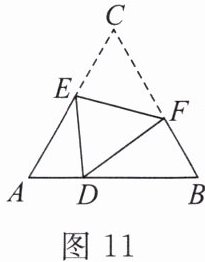 6. 如图 11,在等边三角形 ABC 中,点 D 在 AB 边上,$AD= 4$.将$△ABC$折叠,使点 C 与点 D 重合,折痕为 EF,点 E,F 分别在边 AC,BC 上,$BF= 5$,则$\frac{CF}{CE}= $____.