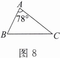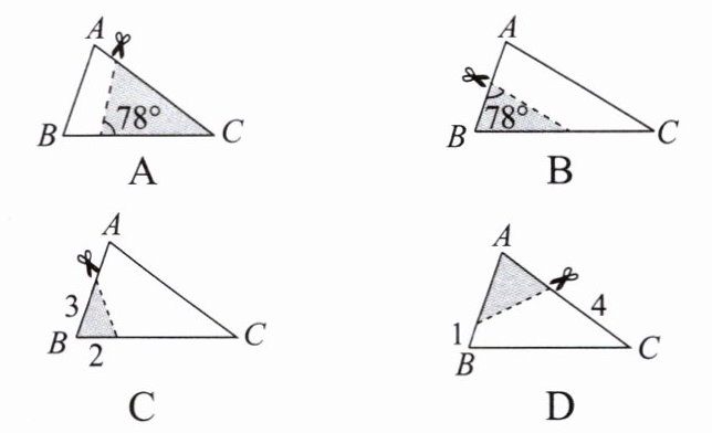 1. 如图8,在△ABC中,∠A= 78°,AB= 4,AC= 6. 将△ABC沿图示中的虚线剪开,剪下的阴影三角形与原三角形不相似的是( ).