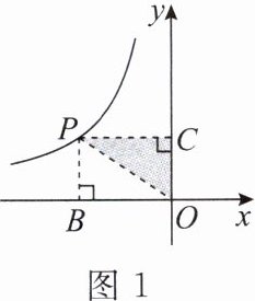 如图 1,已知 $ P(x,y) $ 是反比例函数 $ y = \frac{k}{x}(k \neq 0) $ 的图象上任意一点,过点 $ P $ 作 $ PB \perp x $ 轴于点 $ B $,作 $ PC \perp y $ 轴于点 $ C $,则 $ S_{矩形PBOC} = OB \cdot OC = |x| \cdot |y| = |xy| = $______。