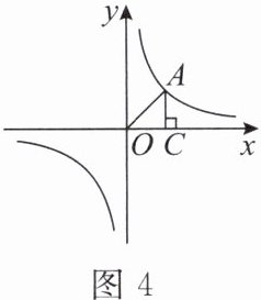 例 1 如图 4,点 $ A $ 在反比例函数 $ y = \frac{k}{x} $ 的图象上,$ AC \perp x $ 轴,垂足为点 $ C $,且 $ \triangle AOC $ 的面积为 $ 2 $。求该反比例函数的表达式。