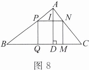 7. 如图8,在$\triangle ABC$中,边$BC = 12\mathrm{cm}$,高$AD = 6\mathrm{cm}$,正方形$PQMN的一边在BC$上,其余两个顶点分别在$AB$,$AC$上,$PN与AD交于点I$.求这个正方形的边长.