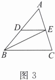 1. 如图 3,在 $ \triangle ABC $中, $ BE $平分 $ \angle ABC $,交 $ AC $于点 $ E $,过点 $ E $作 $ DE // BC $,交 $ AB $于点 $ D $。
