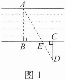 1. 如图1,为估算河的宽度,在河对岸选定一个目标点A,在近岸取点B,C,D,使AB⊥BC,CD⊥BC,点E在BC上,且点A,E,D在同一条直线上。测得BE= 20m,CE= 10m,CD= 20m,则河宽AB为( )。