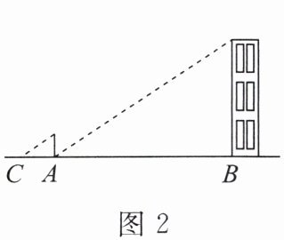 2. 如图2,小明在测量楼高时,测出楼房落在地面上的影长BA为15m,并在同一时刻在A处竖立一根2m高的标杆,测得标杆的影长AC为3m,则楼高为( )。