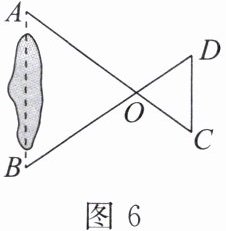 1. 如图6,A,B两地之间有一池塘,要测量A,B两地之间的距离,选择一点O,连接AO并延长到点C,使OC= $\frac{1}{2}$AO,连接BO并延长到点D,使OD= $\frac{1}{2}$BO。测得C,D两点之间距离为30m,则A,B两地之间的距离为( )。