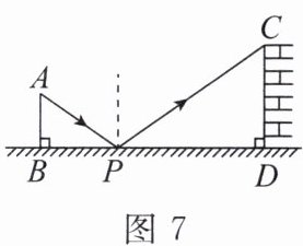 2. 图7是小明设计的用手电筒来测量某古城墙高度的示意图。在地面的点P处水平放置一平面镜,光线从点A发出经平面镜反射后刚好射到古城墙CD的顶端C处。已知AB⊥BD,CD⊥BD,AB= 1.2m,BP= 1.8m,DP= 18m,则该古城墙的高度是( )。