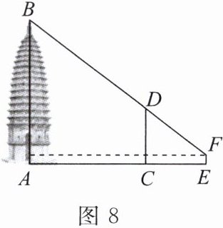 在《数书九章》中记载了一个测量塔高的问题:如图8,AB表示塔的高度,CD表示竹竿顶端到地面的高度,EF表示人眼到地面的高度,AB,CD,EF在同一平面内,点A,C,E在一条水平直线上。已知AC= 20m,CE= 10m,CD= 7m,EF= 1.4m,人从点F远眺塔顶B,视线恰好经过竹竿的顶端D,求出塔的高度。根据以上信息,塔的高度为______m。