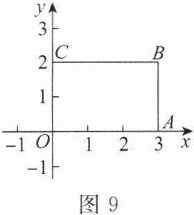 2. (2024 黑龙江绥化中考)如图 9(见左栏),矩形 $ OABC $ 各顶点的坐标分别为 $ O(0,0) $,$ A(3,0) $,$ B(3,2) $,$ C(0,2) $,以原点 $ O $ 为位似中心,将这个矩形按相似比 $ \frac{1}{3} $ 缩小,则顶点 $ B $ 在第一象限的对应点的坐标是( )。