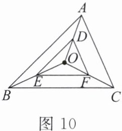 3. 如图 10,$ \triangle DEF $ 是由 $ \triangle ABC $ 经过位似变换得到的,点 $ O $ 是位似中心,$ D $,$ E $,$ F $ 分别是 $ OA $,$ OB $,$ OC $ 的中点,则 $ \triangle DEF $ 与 $ \triangle ABC $ 的面积比是______。