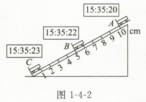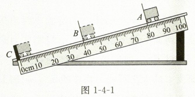 例 如图1-4-1所示是在斜面上测量小车运动的平均速度的实验,让小车从斜面A点由静止开始下滑,分别测出小车到达B点和C点的时间,即可测出不同阶段的平均速度。