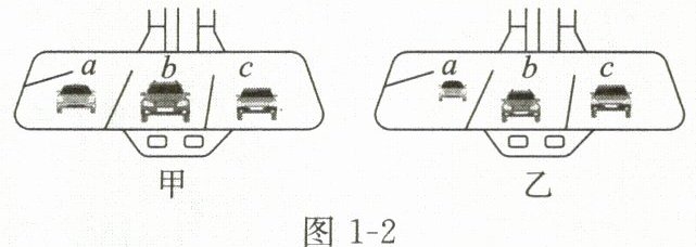 例2 生活应用 图1-2甲、乙为小明从车内后视镜先后观察到的后方车辆运动情景,$a$、$b$、$c$为在平直公路上匀速直线行驶的汽车,以$b$车为