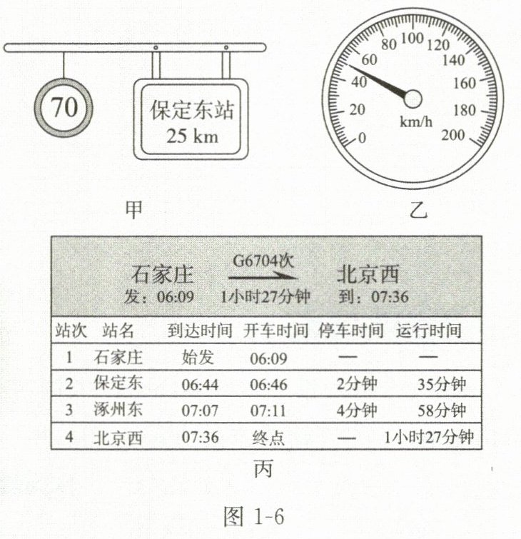 例4 生活应用 小阳同学家住保定,假期去北京游玩。小阳爸爸先开车送小阳到保定东站,然后小阳乘坐高铁去北京。在乘坐汽车途中小阳看到路旁的交通标志牌如图1-6甲所示,汽车的速度表如图1-6乙所示,小阳所乘坐的列车的运行时刻表如图1-6丙所示。已知保定东站到北京西站的路程为$150km$。
