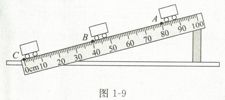 1. 小明用小车、长木板、刻度尺、秒表、木块等器材探究小车沿斜面下滑时速度的变化。实验设计如图1-9所示,让小车从斜面的$A$点由静止下滑并开始计时,分别测出小车到达$B点和C点的时间t_{B}$、$t_{C}$。