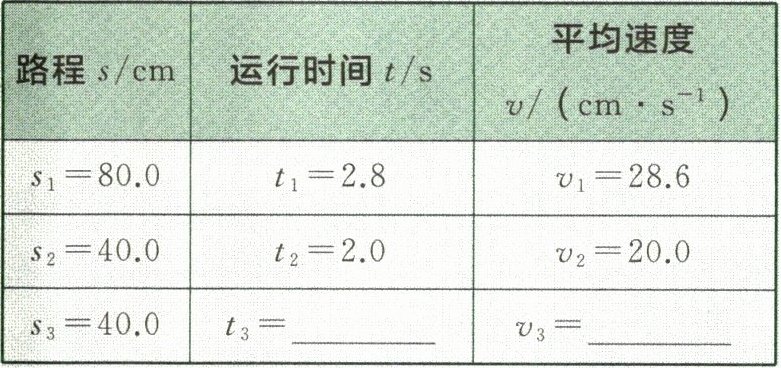 (3)根据表格数据可知t₃ = t₁ - t₂ = 2.8 s - 2.0 s = 0.8 s,平均速度v₃ = $\frac{s₃}{t₃}$ = $\frac{40.0\ cm}{0.8\ s}$ = 50.0 cm/s。