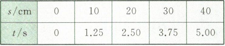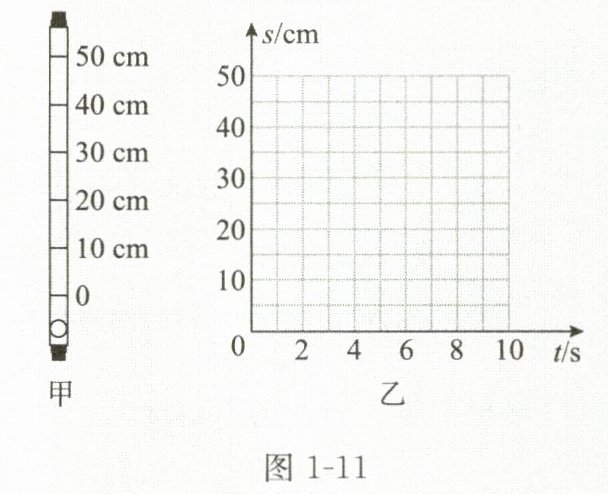 2. 实验创新 图1-11甲是“研究充水玻璃管中气泡的运动规律”实验装置示意图,在内径约$1cm$、长约$70cm$的玻璃管(一端开口)内注水近满,塞住管口并使管中留有一个小气泡,然后在距离玻璃管底部一段距离开始标注$0$刻度,再每隔$10cm$做一个标记;将玻璃管翻转后竖直放置,气泡从底端开始向上运动,从$0$点开始计时,分别测出气泡到达$10cm$、$20cm$、$30cm$、$40cm$处的时间,数据记录如下表所示。