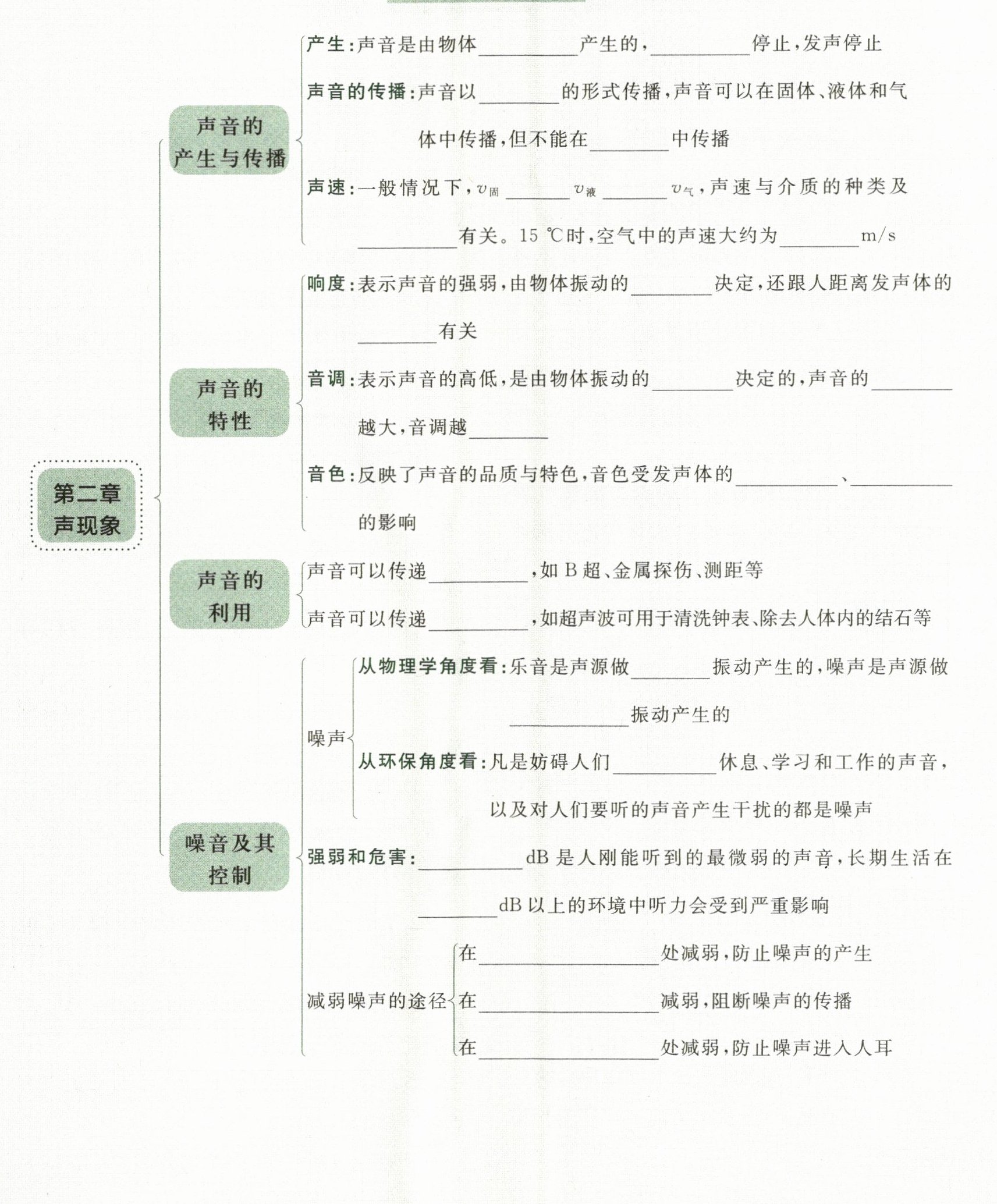 声速:一般情况下,$v_{固}$______$v_{液}$______$v_{气}$,声速与介质的种类及______有关。$15^{\circ}C$时,空气中的声速大约为______m/s