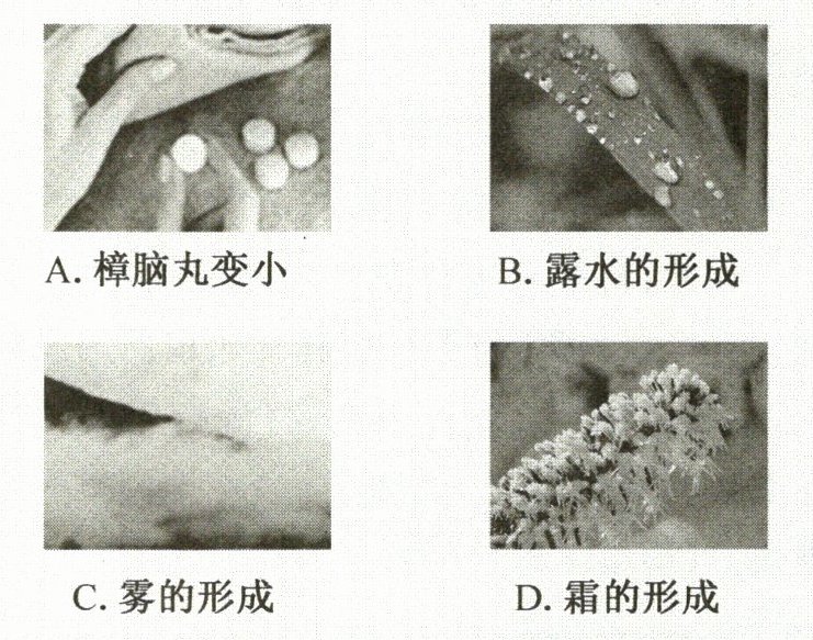 D 【解析】凝华是指物质由气态直接变为固态的过程。长时间放置的樟脑丸变小,是由固态直接变为气态,属于升华现象,选项A不符合题意。露水是水蒸气遇到较冷的植被表面液化形成的小水珠,雾是空气中的水蒸气遇冷液化形成的小水滴,选项B、C不符合题意。霜是空气中的水蒸气遇冷凝华成的小冰晶,属于凝华现象,选项D符合题意。