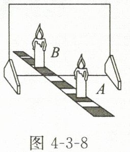 7. 如图4-3-8所示,小新在探究“平面镜成像特点”时,将一块玻璃板竖直放在水平台上,再取两支大小、外形均相同的蜡烛A、B,将蜡烛A点燃放在玻璃板前。