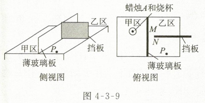 8. 生活应用 小红为小鹏表演了一个“水火相融”的小魔术,她先用一块透明的薄玻璃板将桌子分割成甲、乙两个区域后,再用一块不透明的挡板将乙区域分割成两部分。小红在甲区域内放置了一个盛满水的烧杯,且里面浸没着一支蜡烛A,并在乙区域挡板后的指定位置放置蜡烛B。准备就绪后,小红请小鹏坐在乙区域一侧的某点P(如图4-3-9),并迅速将乙区域已准备好的蜡烛B点燃,在小红一只手敏捷地在小鹏眼前绕过的同时,另一只手悄悄地将挡板拉开一条缝隙MN。当小鹏沿着小红的手指望向蜡烛A时,奇迹出现了:蜡烛A竟然在水中“燃烧”起来!