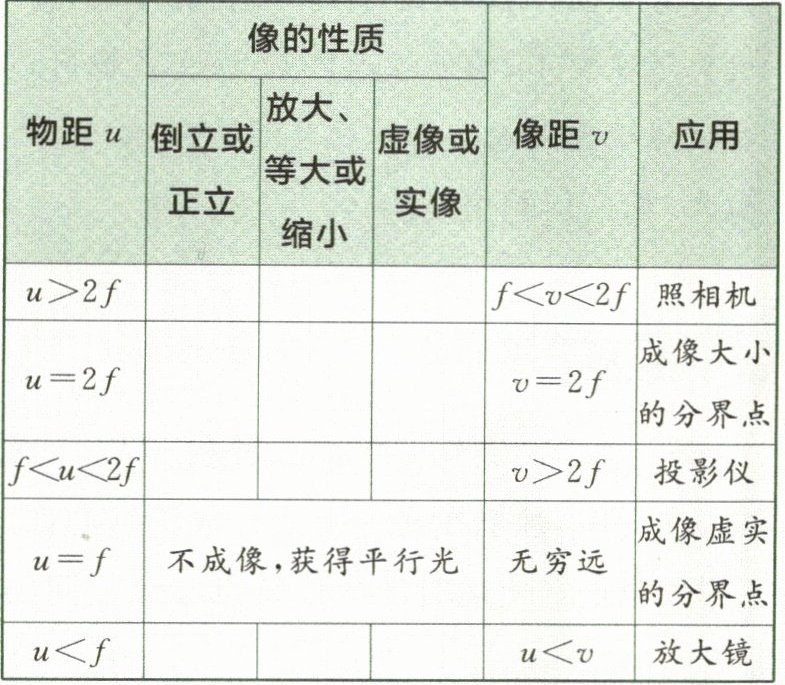 (1) $ u > 2f $,成倒立、缩小的实像,$ 2f > v > f $,应用于照相机和摄像机。