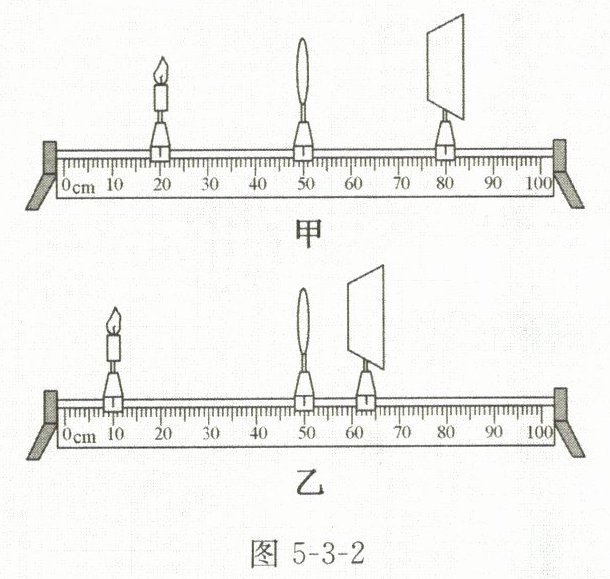 1. 小伟用如图 5-3-2 甲所示的实验装置探究凸透镜成像的规律,所用凸透镜的焦距为 10 cm。