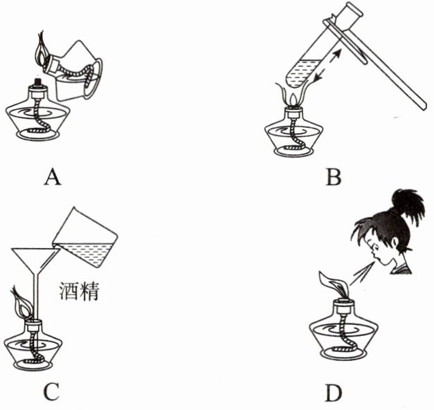 分析与解 要用火柴或木条点燃酒精灯,不能用酒精灯去引燃另一只酒精灯。给试管内的液体加热时,手握试管夹长柄,试管内液体的体积不超过试管容积的1/3,加热时要用酒精灯的外焰。禁止向燃着的酒精灯里添加酒精。熄灭酒精灯时要用灯帽盖灭,不能用嘴吹灭。
