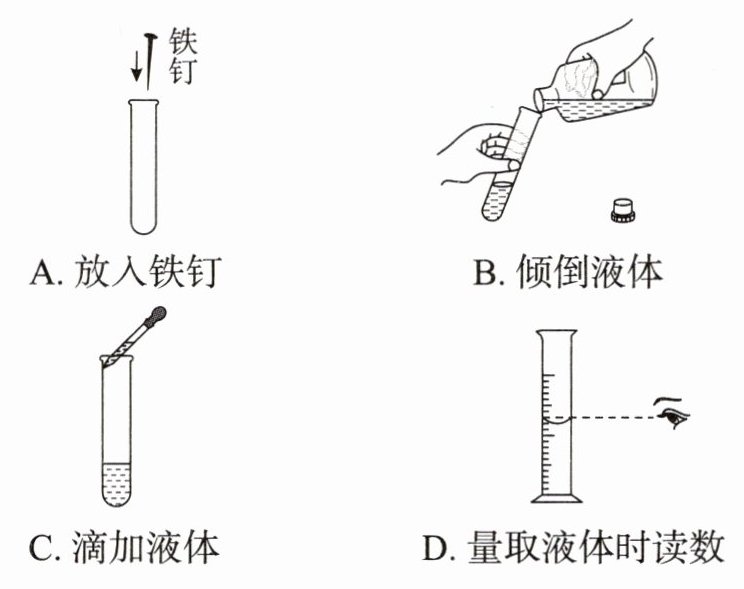 分析与解 将铁钉放入试管时,应先将试管横放,用镊子把铁钉送入试管内,再将试管慢慢竖立起来,以免铁钉打破试管底。倾倒液体时,试剂瓶塞要倒放,标签要向着手心,试剂瓶口紧挨试管口,倾斜倒入,图示操作正确。用胶头滴管向试管中滴加液体时,要保持胶头滴管竖直在试管上方,不可把胶头滴管伸入试管内,以防污染胶头滴管。用量筒量取液体,读数时,视线要与量筒内凹液面的最低处保持水平。