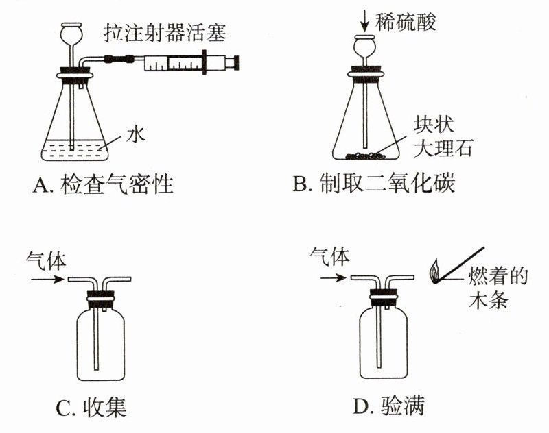 检查 A 项图示装置的气密性时,拉动注射器活塞,装置内气压减小,长颈漏斗导管口有气泡冒出,说明装置气密性良好;实验室制取二氧化碳时,若用稀硫酸与块状大理石反应,由于生成的硫酸钙微溶于水,会覆盖在大理石表面,阻止反应的持续进行;用 C 项装置收集密度大于空气的气体时,气体应由长管进,将空气从短管排出;收集二氧化碳气体验满时,将燃着的木条放在出气口,若木条熄灭,则说明二氧化碳已充满整个集气瓶。