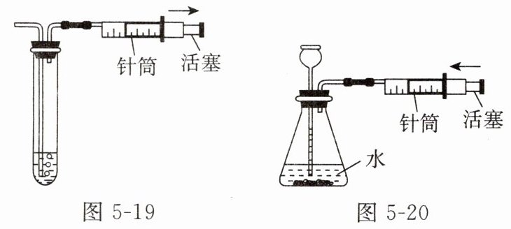 (2) 抽气法:在导管口添加一个注射器,拉动注射器活塞,观察到长颈漏斗下端管口产生大量气泡(如图 5-19);或推动注射器活塞,观察到长颈漏斗内液面上升(如图 5-20),说明装置气密性良好。