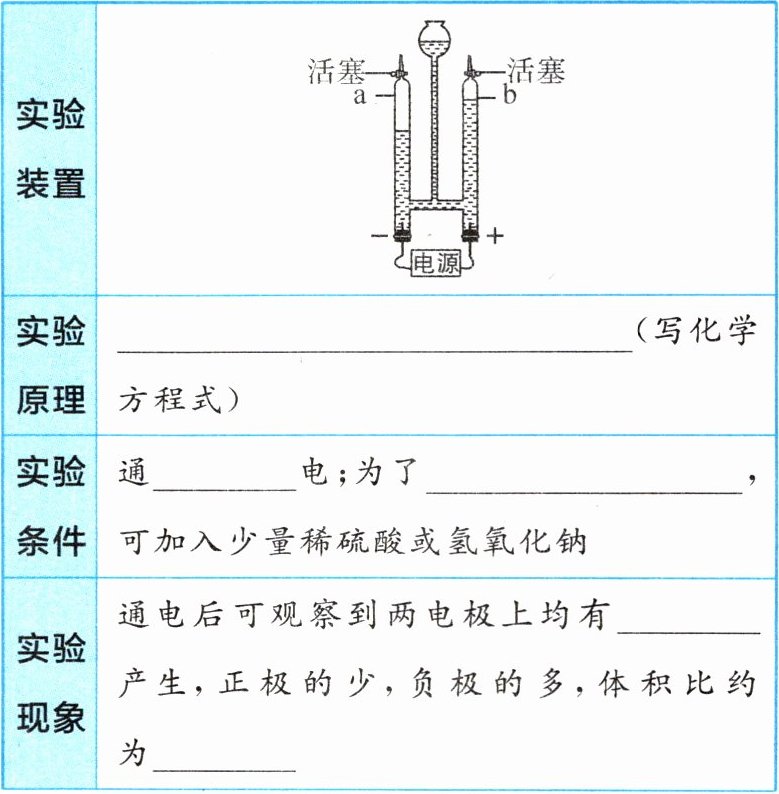 |实验现象|通电后可观察到两电极上均有______产生,正极的少,负极的多,体积比约为______|