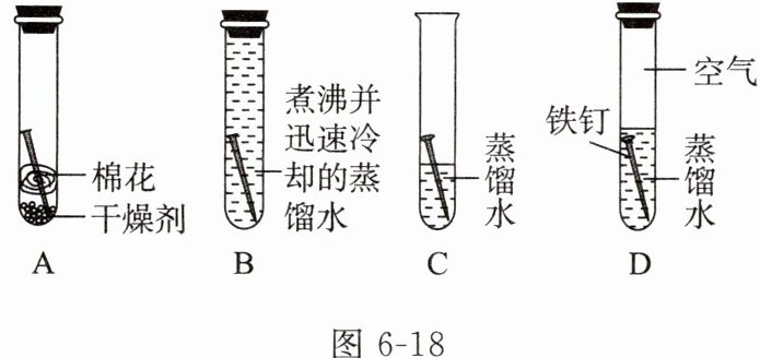 该小组利用图6-18所示的实验对铁钉锈蚀的条件进行探究。一段时间后,实验A、B没有观察到明显现象,实验C、D中铁钉有锈蚀。