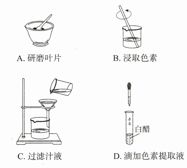 9. (生活实践)小丽用紫甘蓝叶片自制酸碱指示剂,并用于检验白醋的酸碱性,部分操作如下,其中错误的是( )。