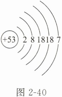 (4) 图 2 - 40 是碘元素的____(填“原子”“阳离子”或“阴离子”)结构示意图。由图可知,碘元素位于元素周期表的第____周期。碘元素的化学性质与____(写元素符号)的化学性质相似。
