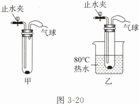 4. 某兴趣小组的同学做可燃物燃烧条件的探究实验:①在试管内放入一小块白磷,关闭止水夹,白磷不燃烧(如图 3 - 20 甲);②将图甲装置放到热水中形成图乙装置,白磷剧烈燃烧,气球胀大。