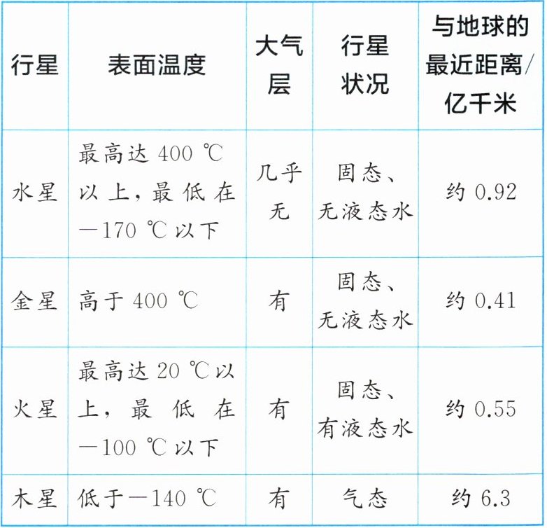 5. (综合思维) 人类很早就有探索宇宙、遨游太空的梦想。科学研究表明,适宜的温度、充足的液态水、一定厚度且适宜生物呼吸的大气是地球存在生命的主要条件。结合下表分析,人类探寻地外生命最有可能登陆的行星是(