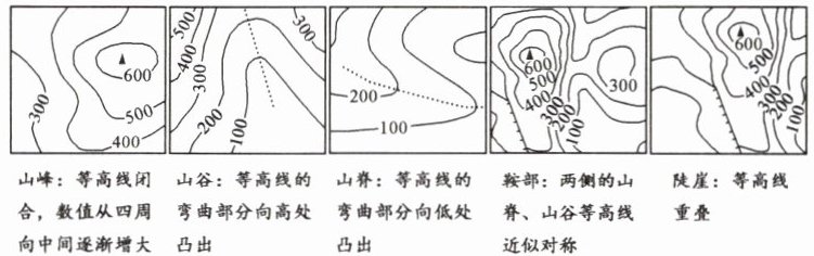 3. 通过等高线的特征,可以识别山峰、山谷、山脊、鞍部和陡崖等常见的地形部位。