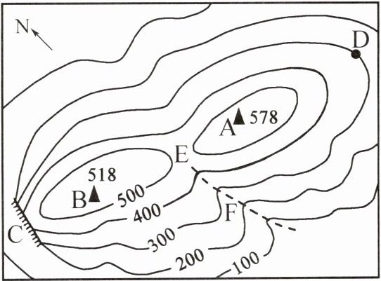 6.A 7.C(提示:相邻等高线的高差为30米,图中可见7条等高线,最大高差在210—240米之间)