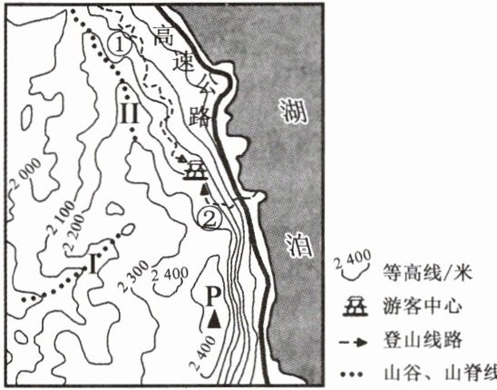 )A.前往游客中心的登山线路,线路①的坡度比线路②的陡