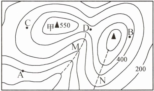 (3)M 虚线M所经过的等高线弯曲部分向高处凸出,为山(河)谷,易发育河流