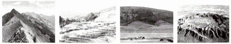 1. 我们学习了陆地五种基本地形类型,除了平原,还有下图中的四种陆地地形类型,它们的名称从左到右依次是(