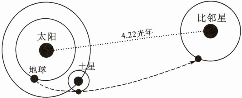 某影片中讲述了地球因太阳“氦闪”而被迫逃离太阳系寻找新家园的故事,该故事提出了“流浪地球”计划。这一计划分为三步:第一步,阻止地球自转;第二步,助推地球进入土星轨道,借助土星引力,将地球弹射太阳系;第三步,地球经历 2500 年的星际流浪,最终抵达新家园——比邻星系(比邻星是距离太阳最近的恒星)。读地球星际流浪的过程示意图,完成 1—2 题。