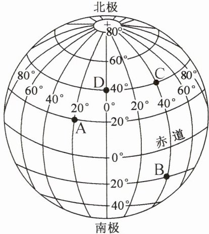 3. 图中 A、B、C、D 四地,位于东西半球分界线上的是(