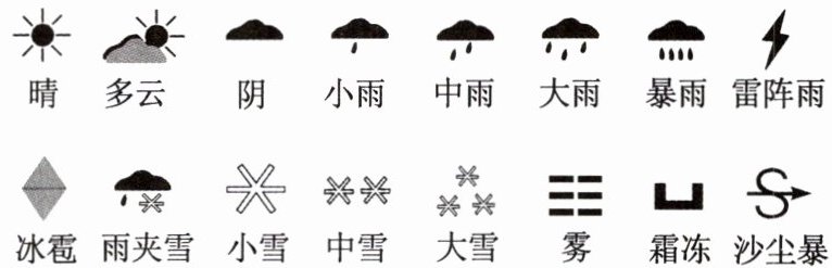 表示天气状况。有时,一个城市名称旁边会出现两个天气符号,表示天气将从某种天气状况转变成另一种天气状况。4. 常用的天气符号