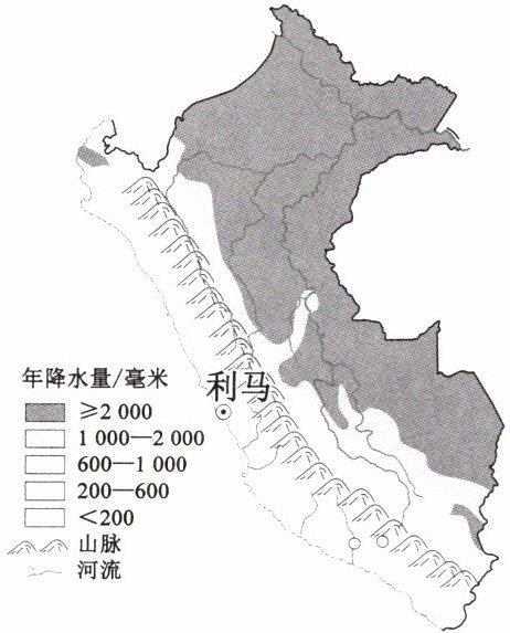 6. (区域认知)读秘鲁多年平均降水量分布图,下列关于该国多年平均降水量分布特点的说法,正确的是(