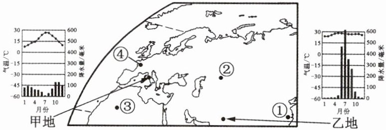 14. 下列关于甲、乙两地气温和降水的叙述,正确的是(